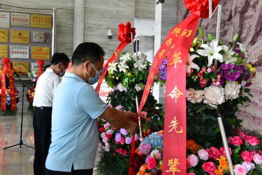 在两当兵变纪念馆革命先辈纪念墙下,组织了向“两当兵变”革命先辈敬献花篮仪式,全场肃立默哀后,左怀理及三和公司党支部书记王小平上前整理花篮缎带,全体党员面向革命先辈鞠躬致敬。