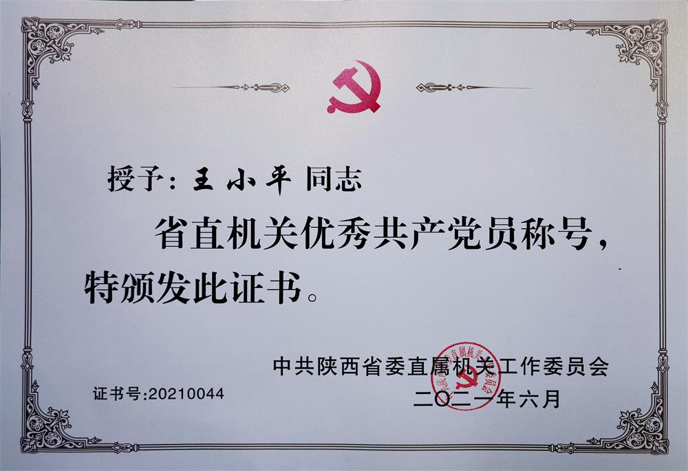 在庆祝建党100周年之际,为表彰先进、树立典型,激励各级党组织和广大共产党员、党务工作者在全面建设社会主义现代化国家新征程中奋勇争先、建功立业,7月8日,中共陕西省委直属机关工委在省委会议室召开省直机关学习贯彻习近平总书记“七一”重要讲话精神暨“两优一先”表彰大会,陕西省三和建设工程有限公司党支部书记、执行董事王小平被授予“陕西省直机关优秀共产党员”荣誉称号。7月9日,在水利厅学习贯彻习近平总书记“七一”重要讲话精神暨“两优一先”表彰大会上,三和公司党支部被授予“厅系统先进基层党组织”荣誉称号,公司总会计师李敏被授予“厅系统优秀共产党员”荣誉称号。
