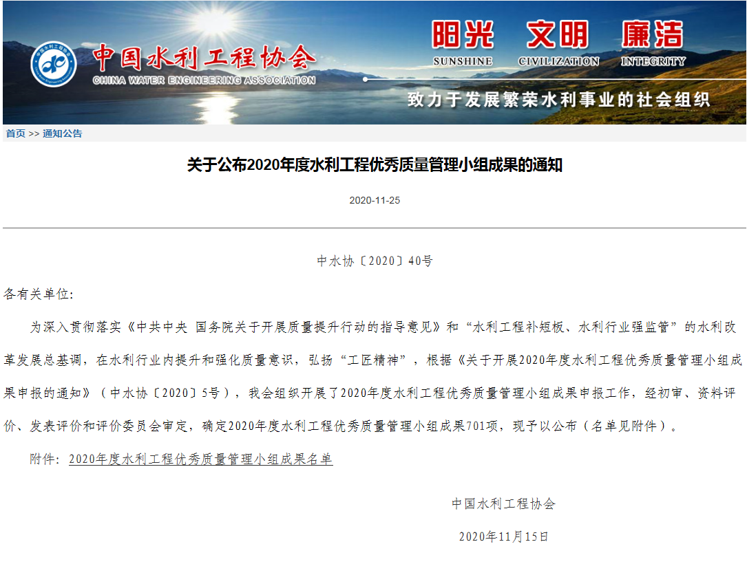 11月25日,中国水利工程协会《关于公布2020年度水利工程优秀质量管理小组成果的通知》(中水协【2020】40号),公布了2020年度水利工程优秀质量管理小组成果名单,三和公司荣获II类成果奖项2项,III类成果奖项1项。
