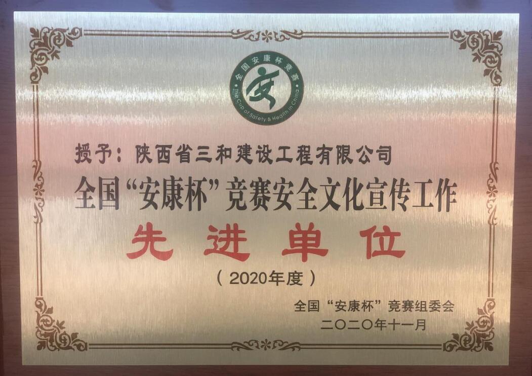 2020年11月20日,全国“安康杯”竞赛活动组委会发文表彰了2020年全国范围内参加“安康杯”竞赛活动中表现优异的单位,陕西省10家单位斩获安全文化宣传工作“先进单位”称号,陕西省三和建设工程有限公司名列其中。