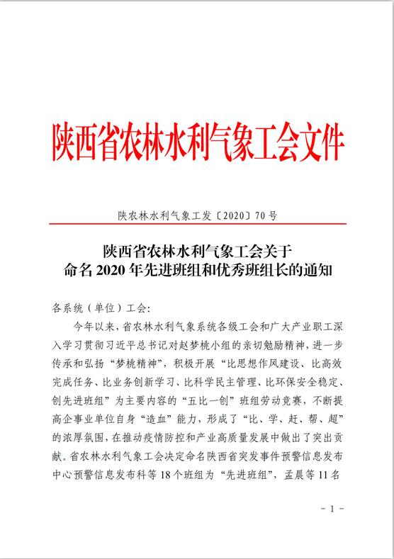 三和公司质量安全部荣获2020年陕西省农林水利气象工会“先进班组”称号
