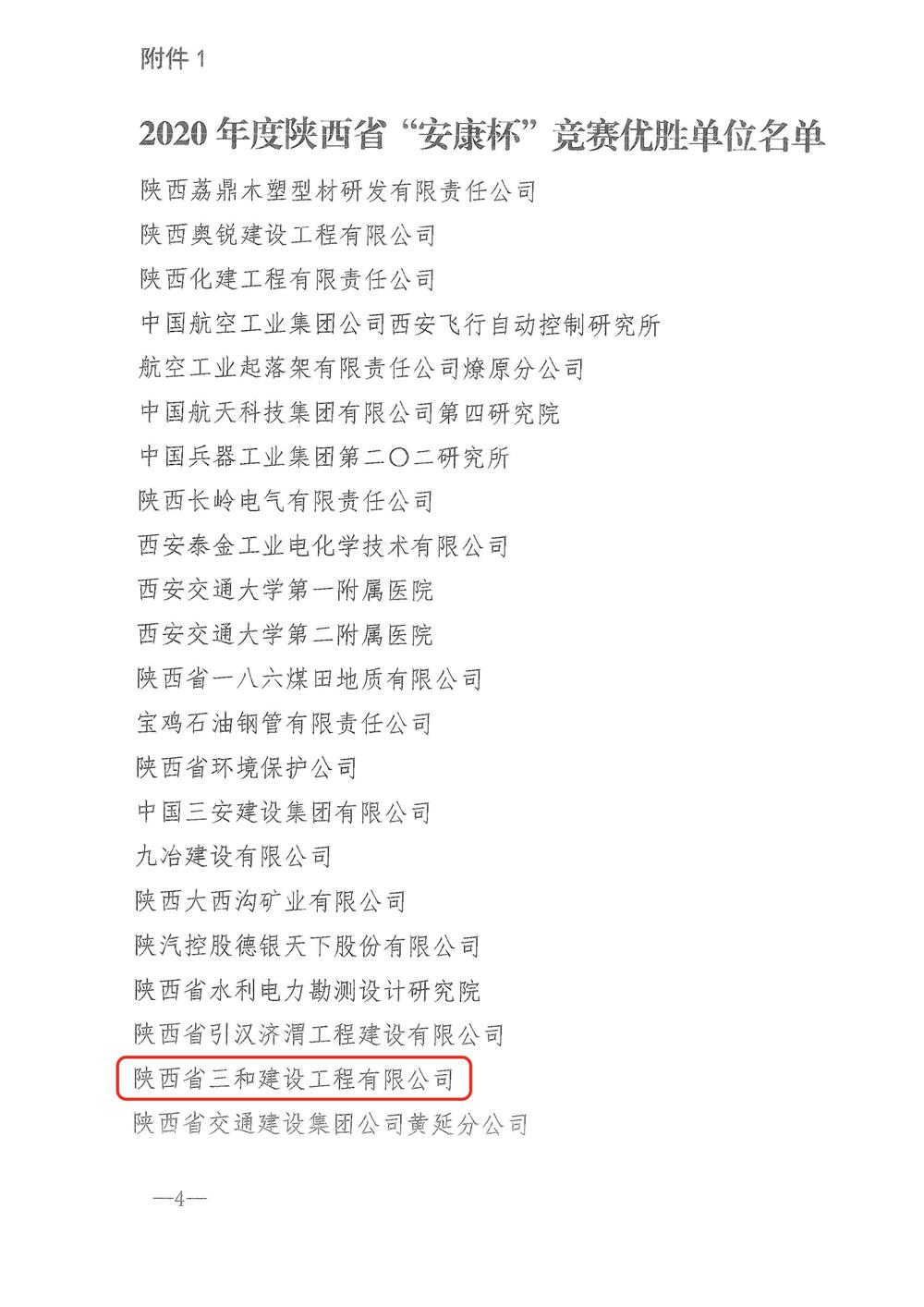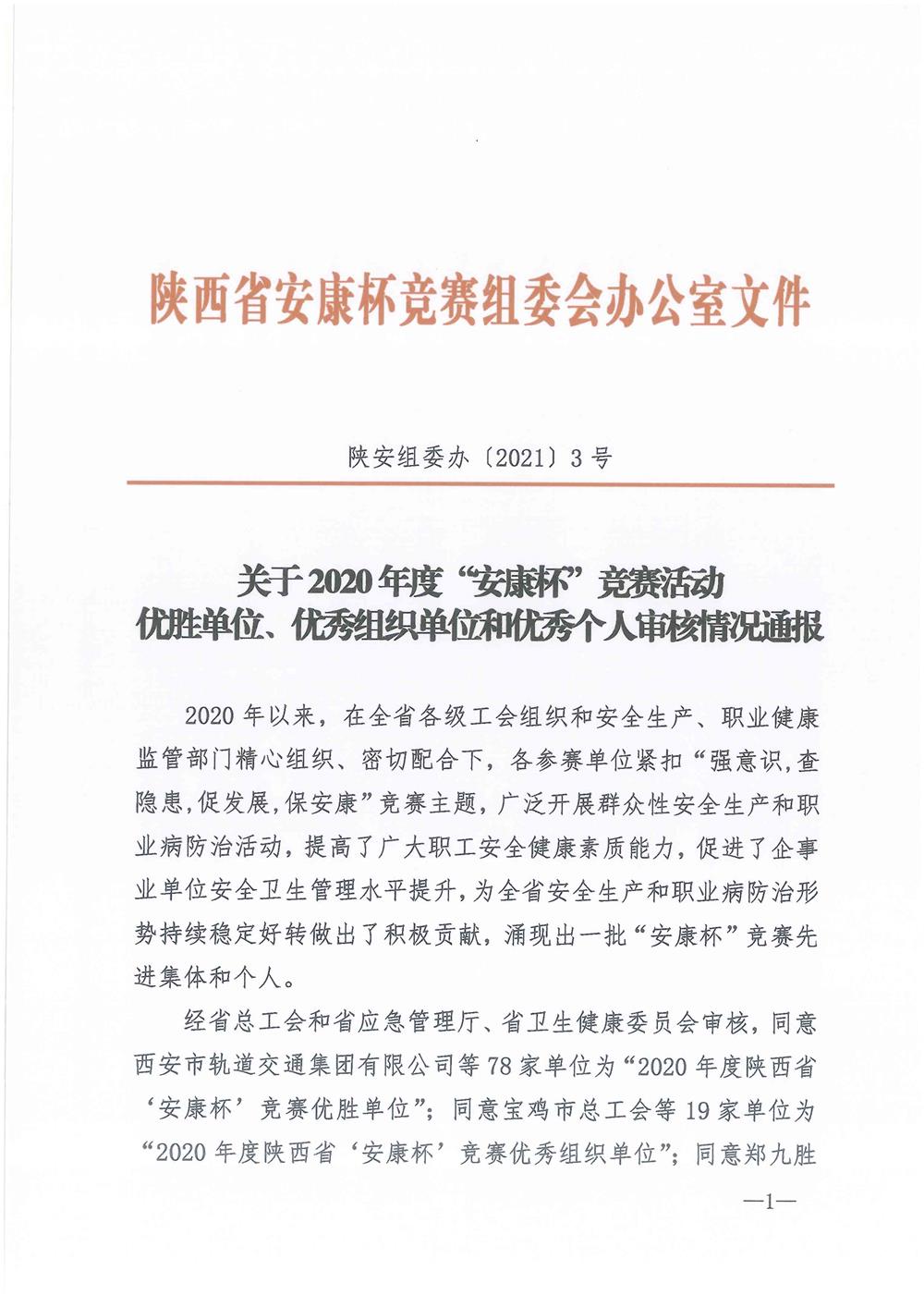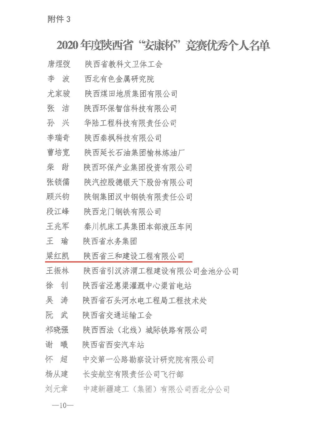 近日,陕西省总工会、陕西省应急管理厅、陕西省健康委员会联合发文(陕安组委办【2021】3号),表彰陕西省“安康杯”竞赛优胜单位、优秀组织单位和优秀个人,陕西省三和建设工程有限公司被授予2020年度陕西省“安康杯”竞赛优胜单位称号;公司总工程师粱红凯同志被评为“安康杯”竞赛优秀个人。