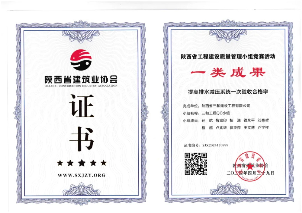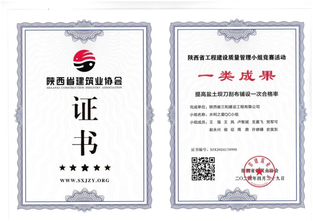 近日,在陕西省建设工会委员会与陕西省建筑业协会共同举办的“2024年工程建设质量管理小组竞赛”活动中,陕西省三和建设工程有限公司推选的《提高排水减压系统一次验收合格率》和《提高盐土坝刀刮布铺设一次合格率》2项成果全部荣获I类成果奖。