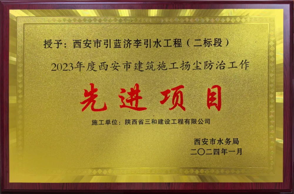近日,陕西省三和建设工程有限公司承建的西安市引蓝济李引水工程(二标段)被西安市水务局评为“2023年度西安市建筑施工扬尘防治工作”先进项目。