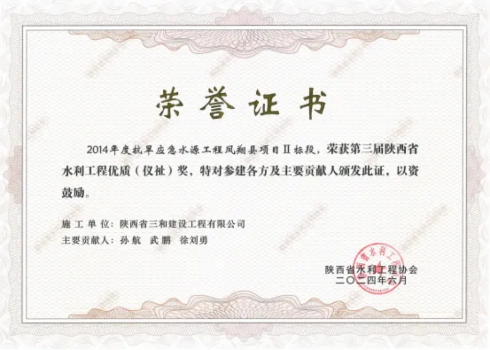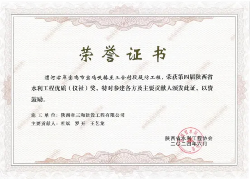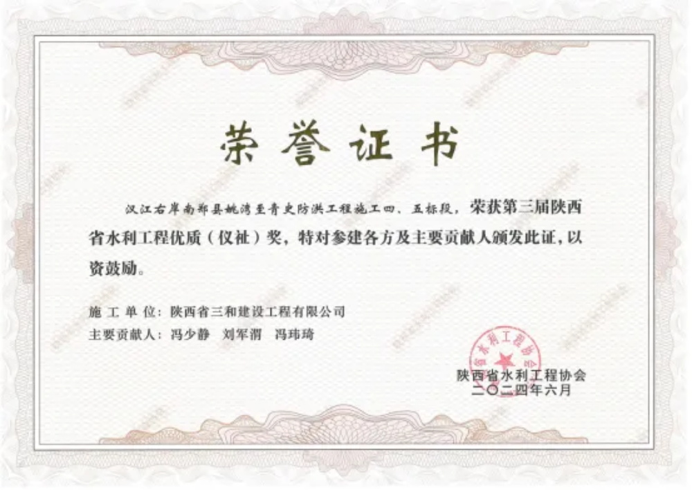 “陕西省水利工程优质(仪祉)奖”是陕西省水利行业优质工程的最高奖项,是以工程质量为主,兼顾工程建设管理、技术创新、工程效益和社会影响等因素设置的优秀水利建设工程奖项。三和公司获此殊荣,是企业施工质量、管理水平达到省内领先水平的具体体现。